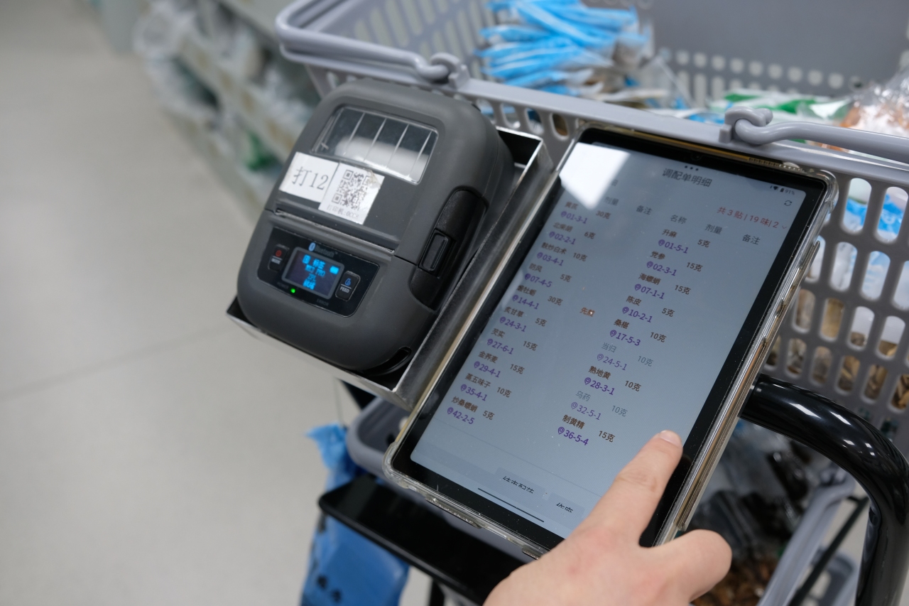 共享中藥房的運營離不開數字化,不僅墻上掛著電子大屏,連每一輛調配藥材的推車上,也都安裝著一塊塊小屏幕,顯示患者的處方信息、藥品明細,每種中藥材的位置、劑量,并備注煎藥順序。屏幕旁配備一臺打印機,可以打印出信息標簽,作區分說明使用,標簽上印有二維碼,以供掃碼核驗。