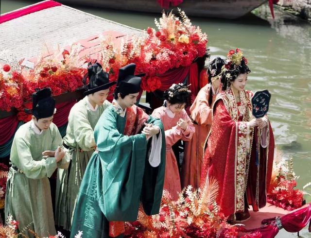 梧田的水上婚禮民俗,也是東甌文旅想要重拾的文化符號。為此,團隊打造“梧田喜事”IP,連續三年舉行漢婚大典活動。“選擇漢婚,不僅因為其婚服、配飾的華美,更因其涉及的古禮是很好的傳統文化承載。”相關工作人員說:“第一年我們做的是宋朝的漢婚,次年做了明朝、唐朝兩場,今年又回歸宋朝。后續我們將探索更多的可能,如民國婚俗、上世紀80年代父母輩的傳統婚禮等。”