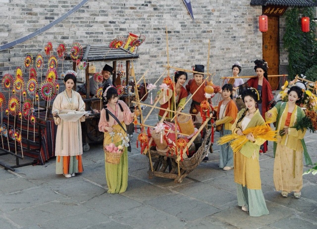 上元節的百人漢服巡游,吸引來了眾多漢服愛好者。壓軸秀上24節氣的擬人形象悉數登場:小滿時琵琶黃,對應的節氣擬人是一位綴著琵琶插梳的貴婦人;處暑高粱紅,有關的節氣擬人是穿著紅褂的賣酒人家群像。從皇室貴胄到農家郎,如同打翻歷史畫卷掉出的萬千眾生相。