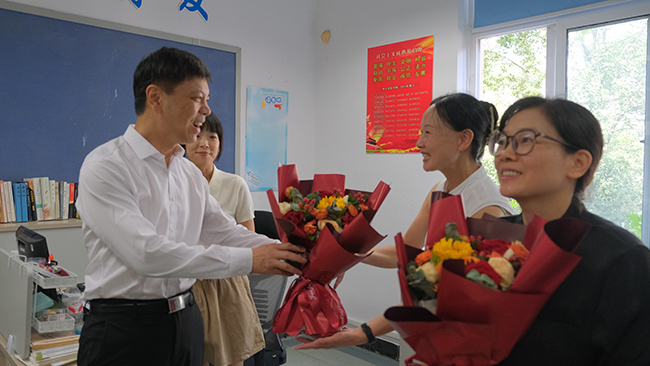 慰問中,盧旭帆實地查看校園環境,詳細了解學校的辦學特色、師資隊伍建設以及教育教學開展等情況。在看望教師代表時,盧旭帆與他們親切交談,關切詢問其工作生活情況,并送上鮮花和祝福,對大家的辛勤付出表示感謝。他表示,教師是立教之本、興教之源。希望廣大教師堅守教育初心,深耕教學一線,以更飽滿的熱情、更務實的作風投入到教育教學工作中,為推動全區教育事業高質量發展貢獻更大力量。