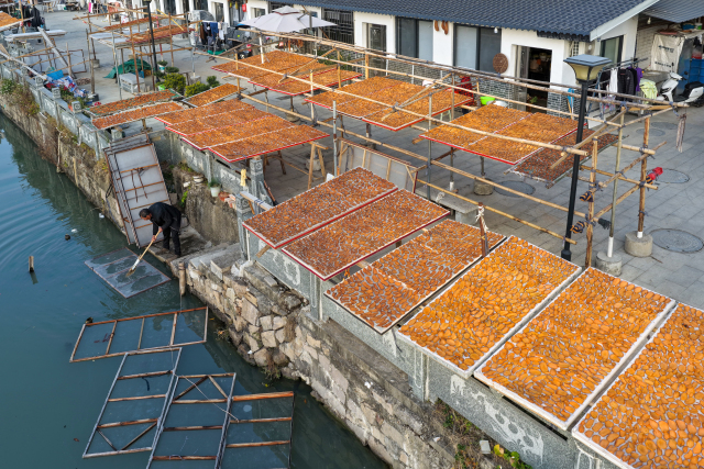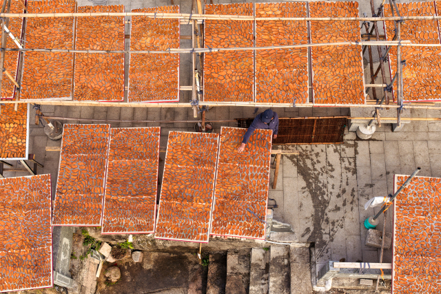番薯干,溫州也稱作“番薯棗”。連日來,甌海區仙巖街道社帆村村民趁著天氣晴好曬制“番薯棗”。該村已有20余戶村民參與曬制,在院前屋后鋪開仿佛連成了“金色海洋”。當地村民將番薯曬制成“番薯棗”銷售,使番薯價值翻倍的同時,也讓家庭增收。